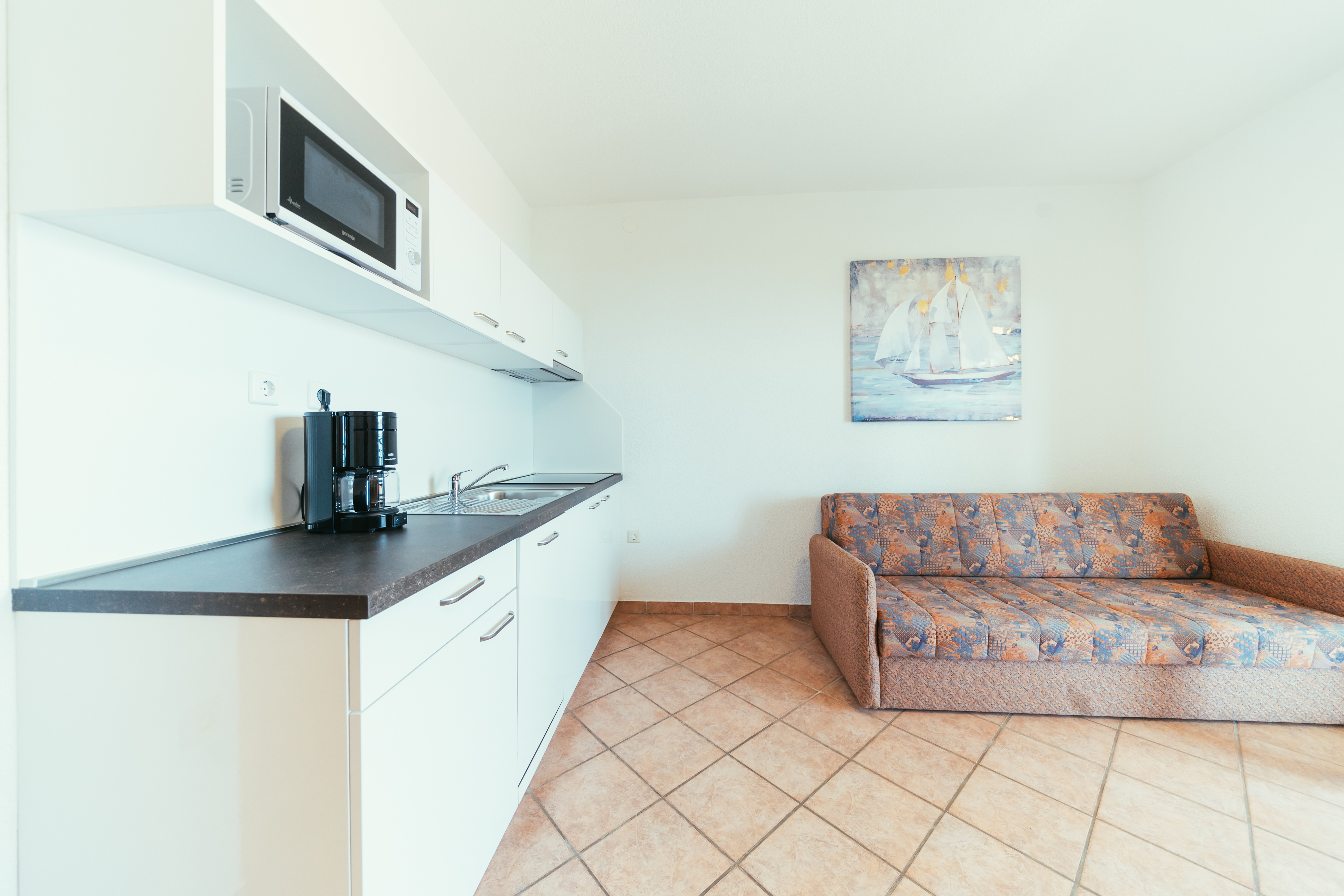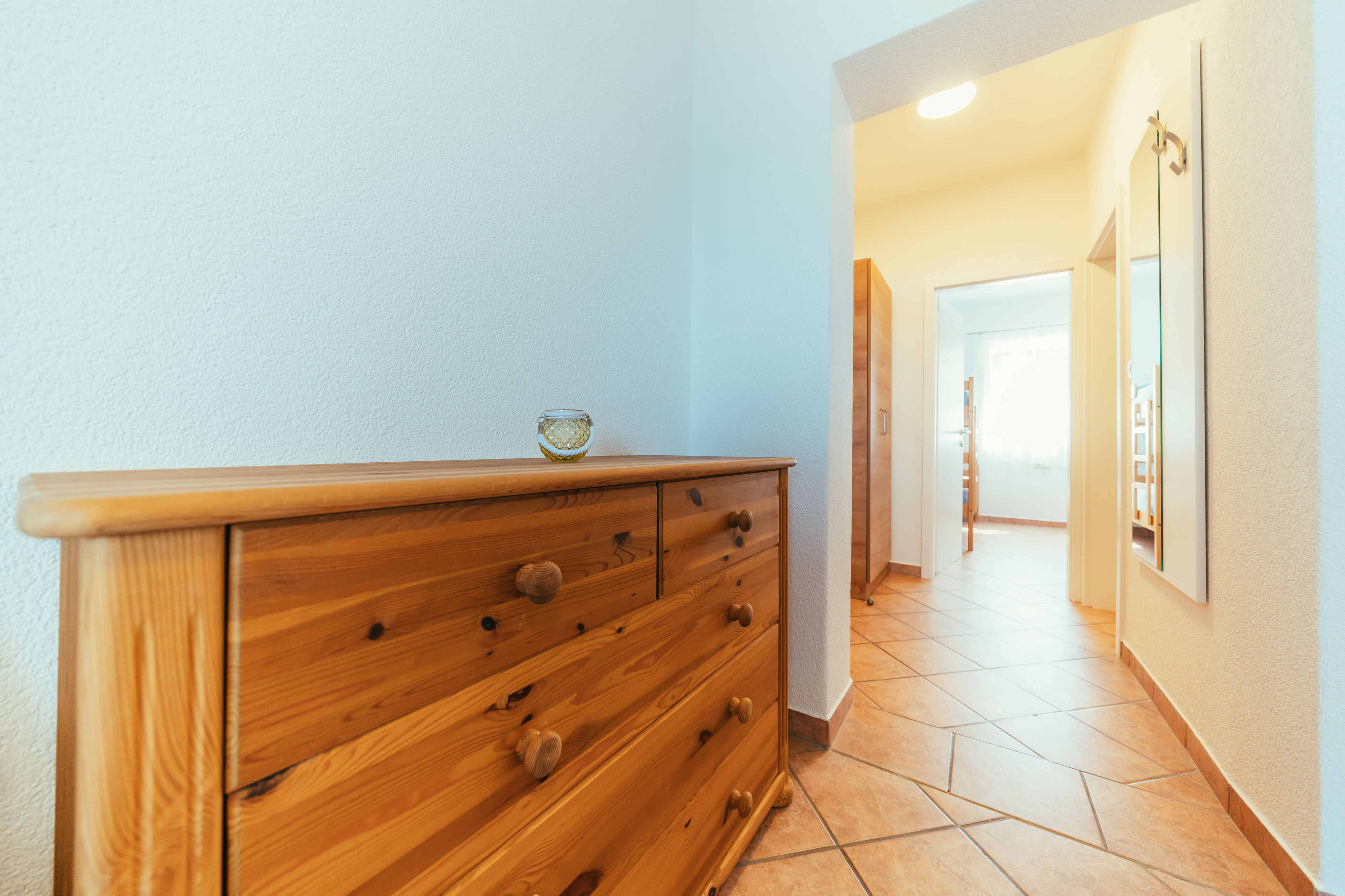 Das Apartment verfügt über ein Schlafzimmer mit Doppelbett, Stockbett und einem geräumigen Kleiderschrank. Ein zusätzlicher Schrank und eine Gaderobe befinden sich im Flur. Bettwäsche ist ebenso vorhanden wie Handtücher in dem Badezimmer mit Badewanne. Im Wohnraum befindet sich ein großes Sofa/Zusatzbett, eine gemütliche Sitzecke und eine Küchenzeile. Die Küchenzeile ist ausgestattet mit Kaffeemaschine, Wasserkocher, Mikrowelle, Herd mit 4 Platten, Spülmaschine und Kühlschrank mit Gefrierfach.